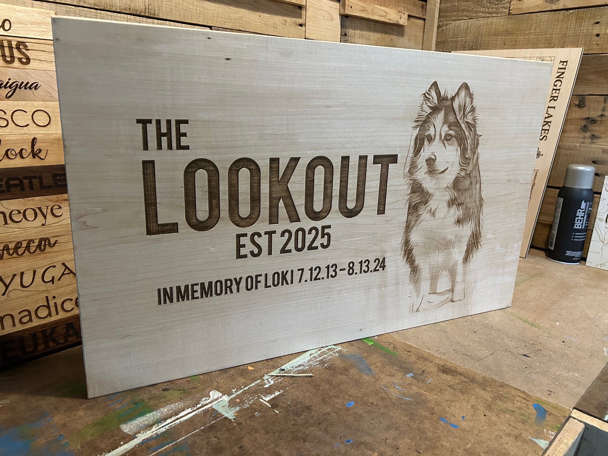 Another customer wanted us to laser engrave a sign for their newly constructed cabin which they affectionately named "The Lookout" in memory of their beloved dog, Loki.