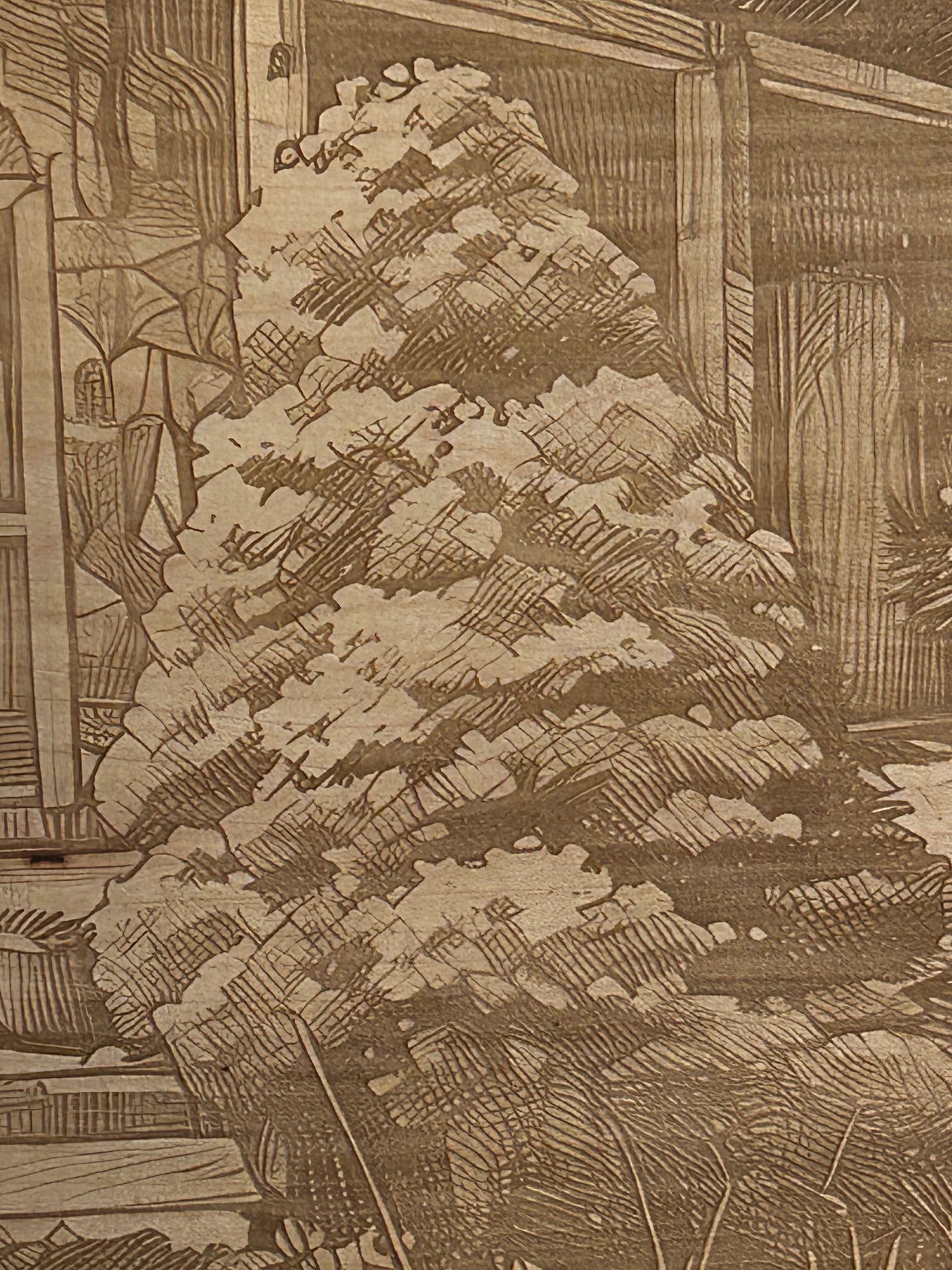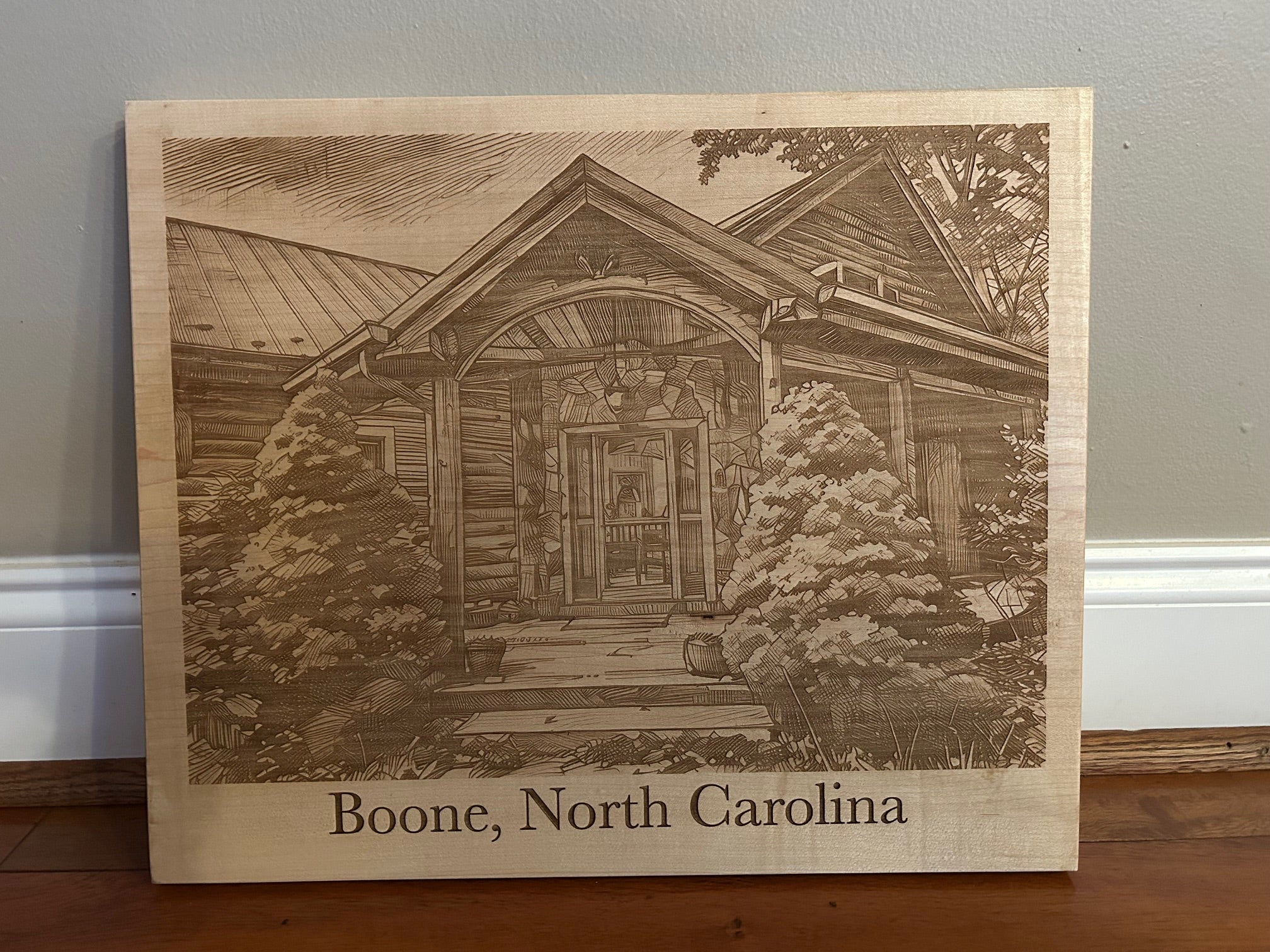 For photo engraving we recommend using Hard Maple, a wonderfully golden-colored light wood which engraves in some beautiful shades of brown. The project pictured below was engraved on a Maple slab measuring 15" x 18" by just over one inch thick.