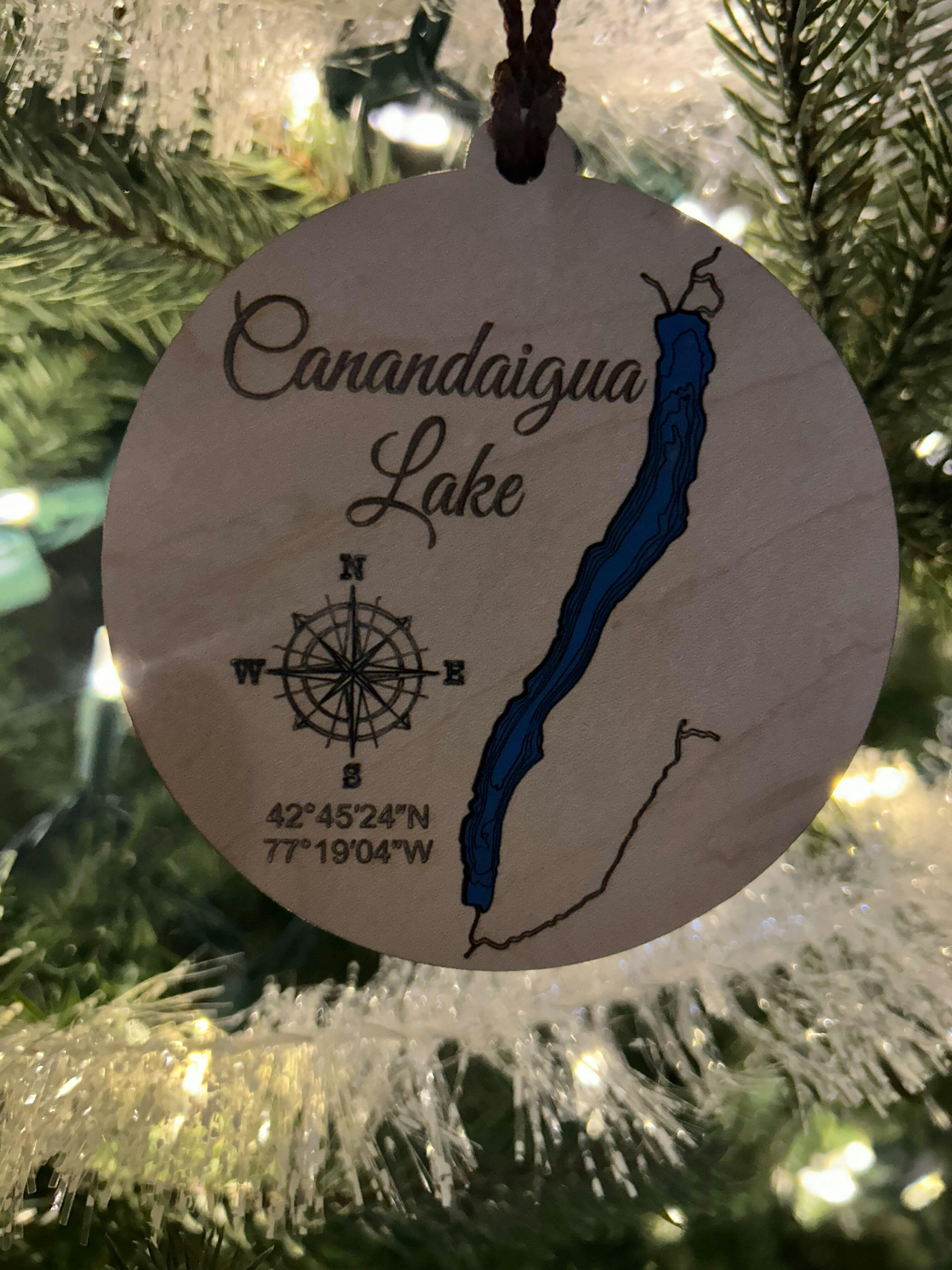 Each ornament measures just over 3-1/2" in diameter and is laser cut and engraved from two layers of 1/8" Walnut or Maple Plywood. The top layer includes the name of the Lake, its latitude and longitude coordinates, a nautical compass and a deep blue bathymetric insert of the lake complete with depth layers. The inset blue lake adds such a nice contrast to the maple or walnut top layer. You are going to love them!