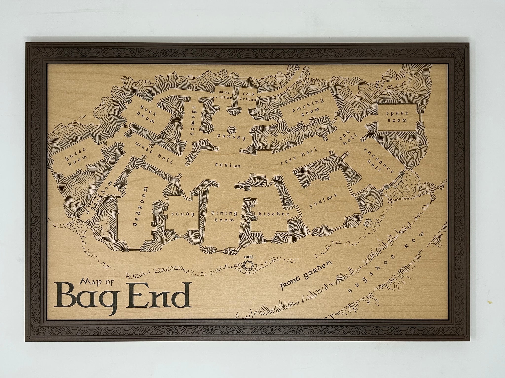 This laser-engraved map is a wonderful interpretation of what the Floor Plan of One Bagshot Row may have been. As the Bagginses were very well thought of and their home openly coveted by the Sackville-Bagginses, it was, of course, among the finest in all of the Shire with rooms and passages, a well-appointed kitchen, pantry, guest bedroom, wine cellar and more!