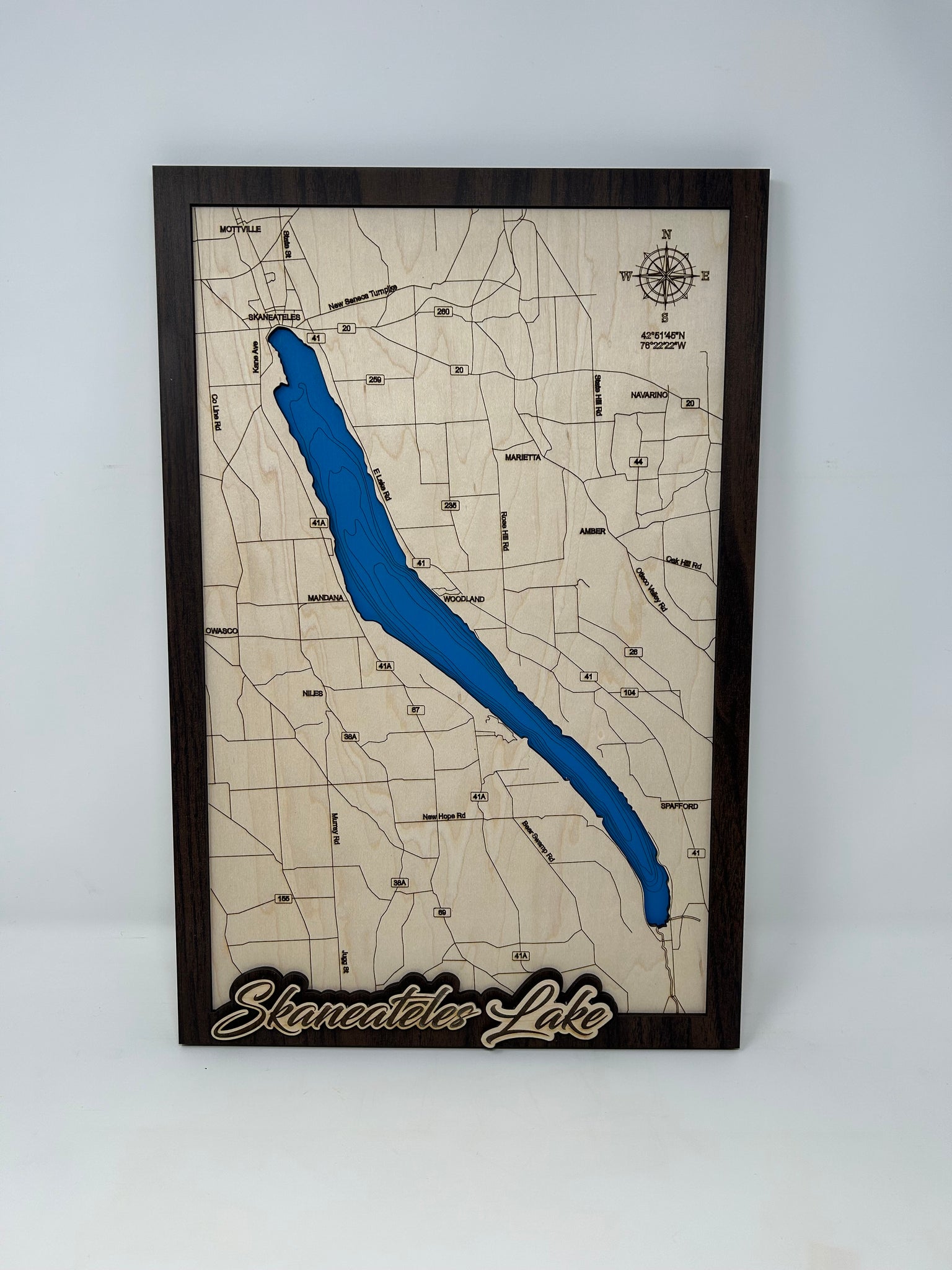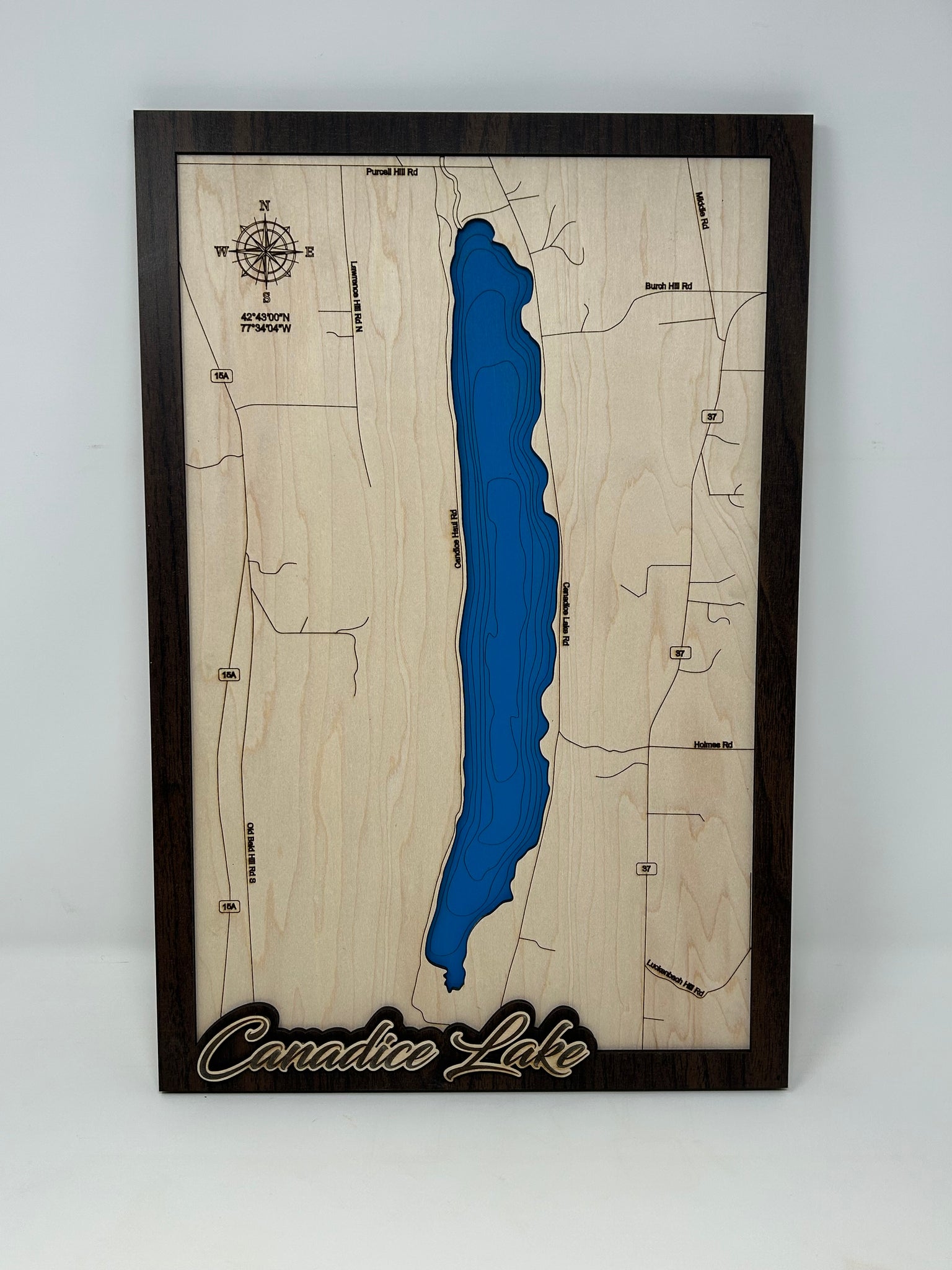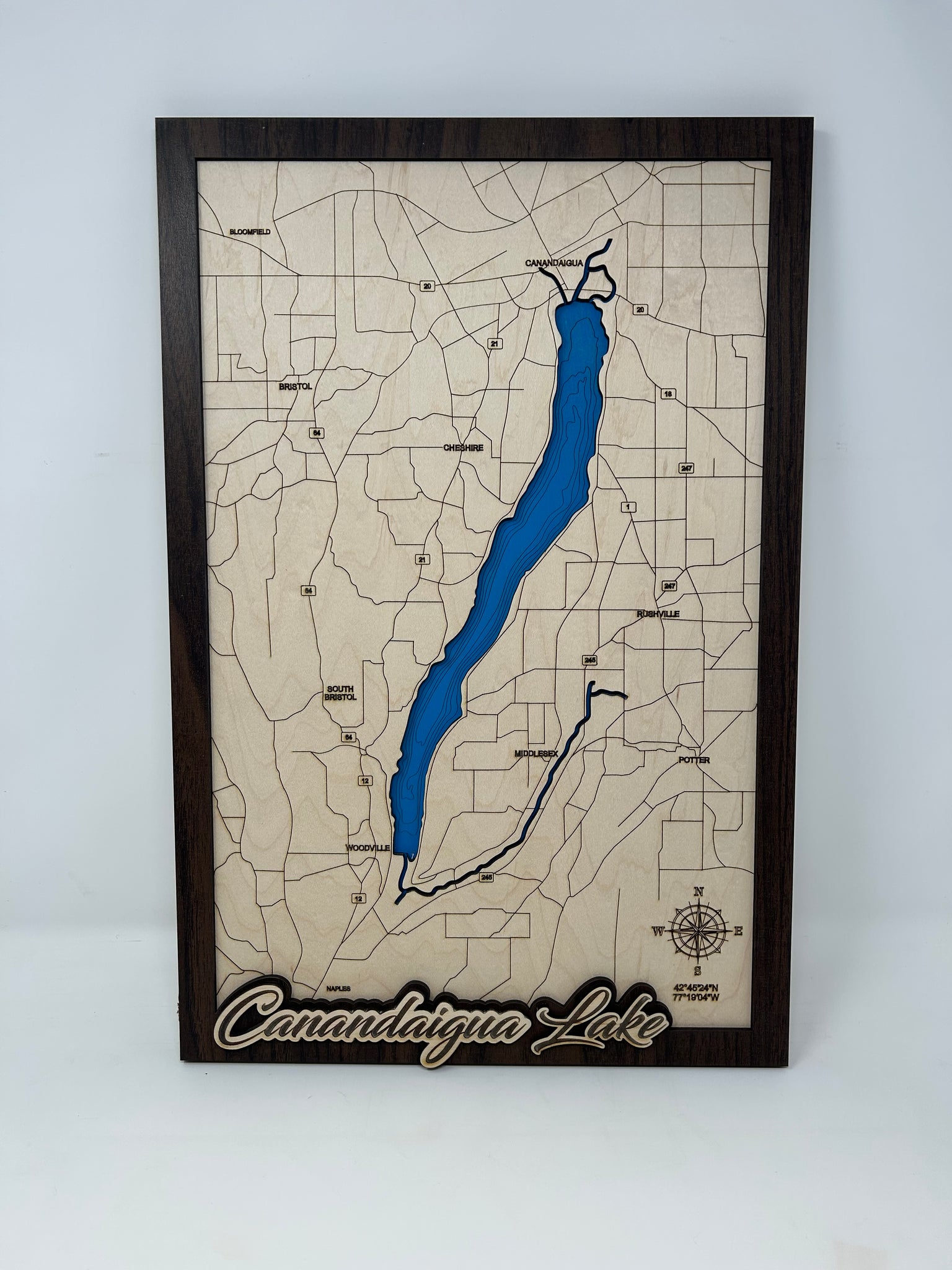 Lake Name Layer: The finishing touch on these maps is the finger lake name in engraved maple that I emboss on the walnut frame.  This gives the lake map a bit more contrast and pop.