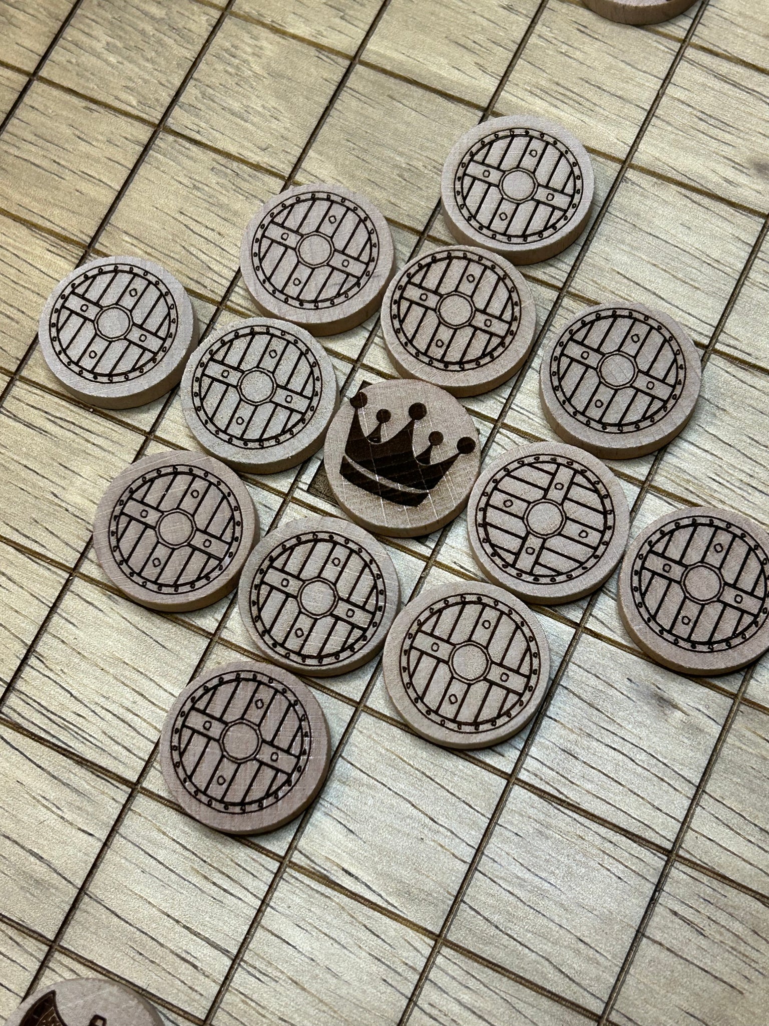 The Viking King's team plays a game primarily of defense, guarding and protecting the king (starting in the center of the board). The objective of the Viking King's team is to protect the king all the while attempting to move him to one of the four specially marked corners. This team starts with twelve defenders and the King.